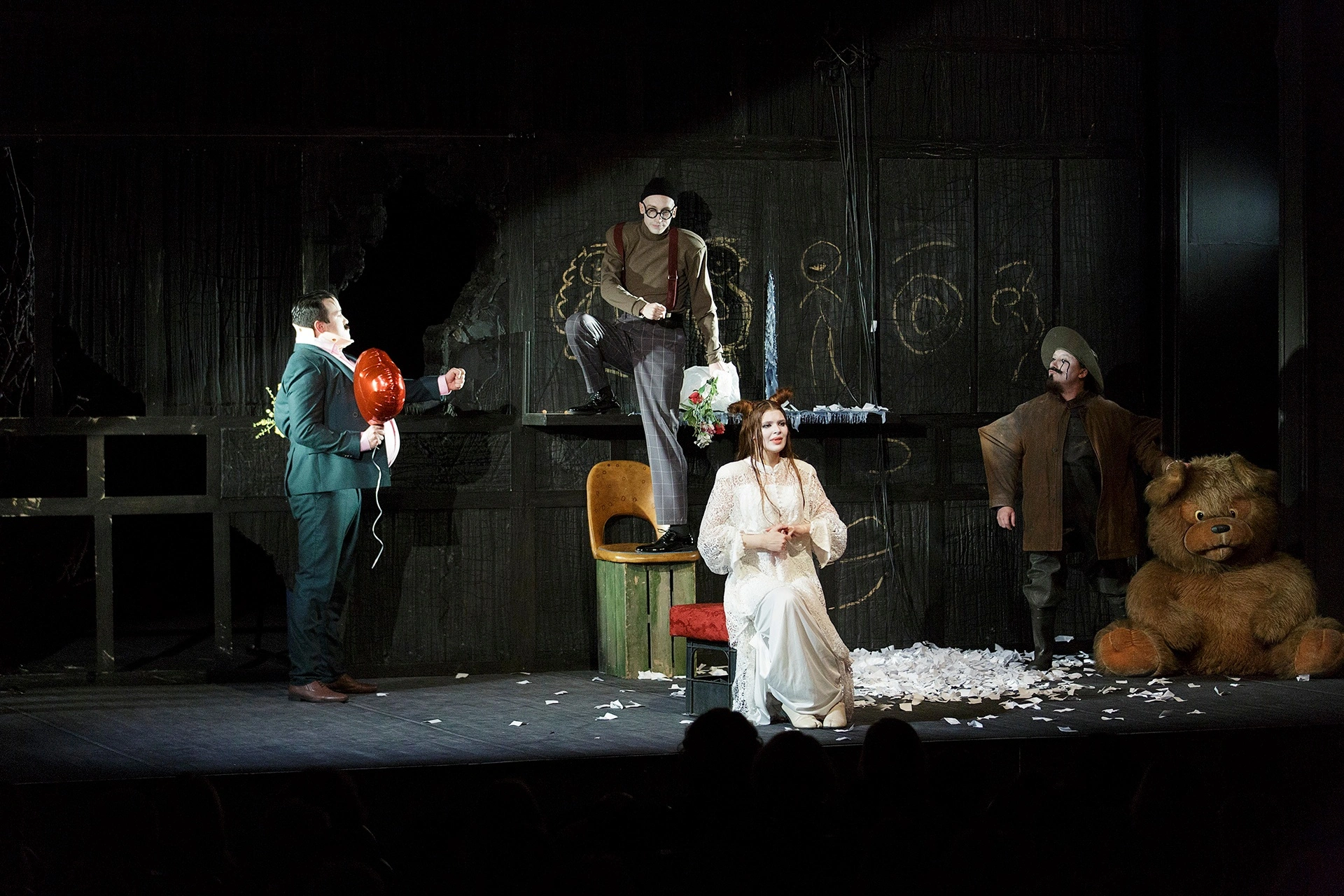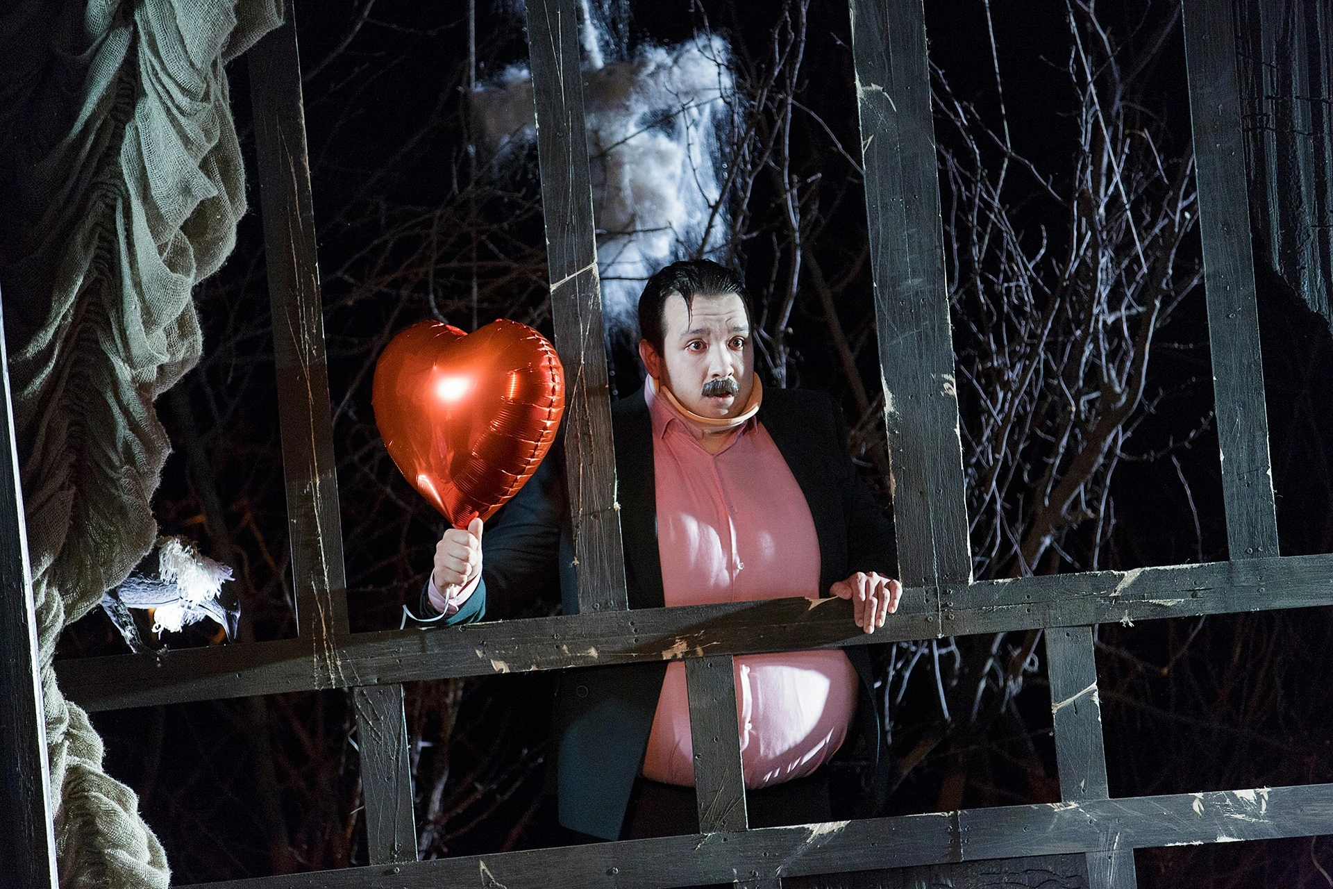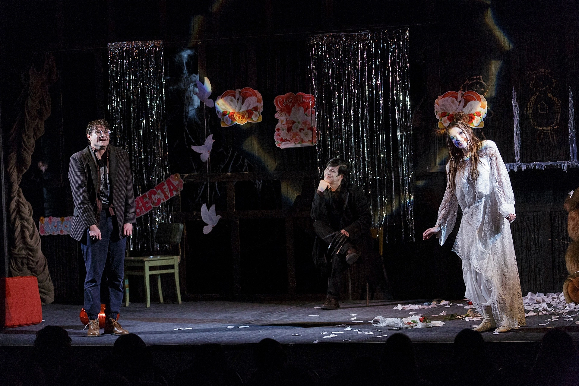 Место действия — столица. У людей от бешеной динамики города возникает выгорание душ – вот и выгоревший мир мы видим чуть ли не буквально. Из мира будто испарилась любовь. Новому миру нужны новые герои: кроткие, послушные, слабовольные, неспособные на поступки, на перемены. Из всех как-будто бы вынута душа. В этом мраке и холоде людям как никогда не хватает тепла, близости. Человеку нужен человек. Все герои пьесы говорят о женитьбе, готовятся к ней, говорят о ней, спорят, суетятся, но никто не говорит о любви. Только деньги, статус, форма. Гоголевский абсурд! В таком мире самое парадоксальное, что может произойти — живое, человеческое, тёплое чувство.